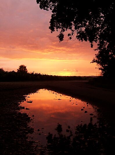 Wie ihr seht, zeigte sich der Himmel gestern ganz anders, obwohl das Foto zur gleichen Tageszeit entstand. Die Pfütze ist nicht mehr ganz so groß, da gestern nicht so viel Regen fiel, wie beim letzten Unwetter. Dafür gab es ein gigantisches rotgoldenes Licht, das die untergehende Sonne von unten an die Wolkendecke warf.