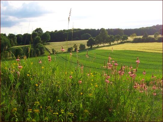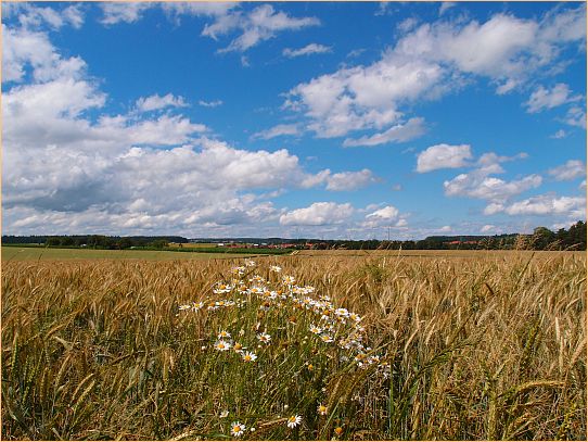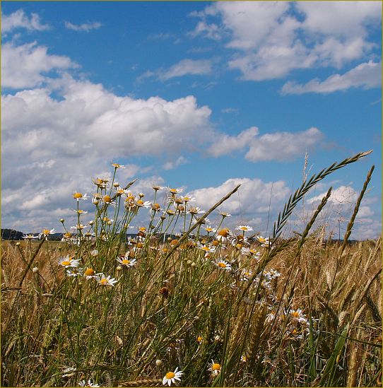 So schön es auch im Wald ist, ... gern, sehr gern wander ich auch auf Feldwegen durch die Landschaft. Hier ist es die Weite, der Geruch von Heu und Kamille, der liebliche Gesang der Lerche, die Feldblumen und der freie Blick über die Landschaft und den Himmel, die mich so faszinieren.