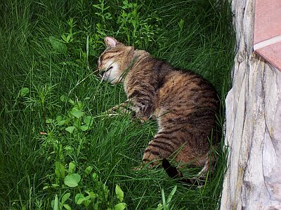... und träumte im hohen Gras wohl davon, ohne Fell rumlaufen und eine kätzische Freikörperkultur pflegen zu können.