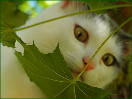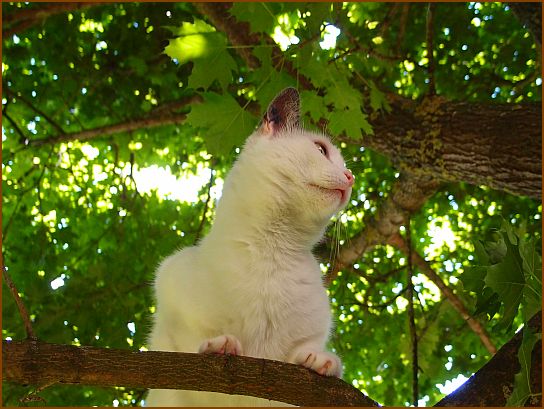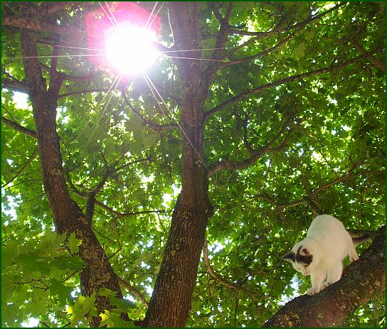 Lissy liebt unser Ahornbäumchen, wie ihr wisst. Hab ja schon einige Fotos gezeigt, aber ich finde es immer wieder so lustig, wie sie darauf rumturnt, dass ich immer wieder zur Kamera greifen muss. Das Schöne für die kleine Kletterhexe ist, dass der Baum innen fast keine Blätter trägt. Wenn man unter ihm steht, ist es wie unter einem Blätterschirm oder -dach, durch das manchmal ein Sonnenstrahl dringt, wie hier ...