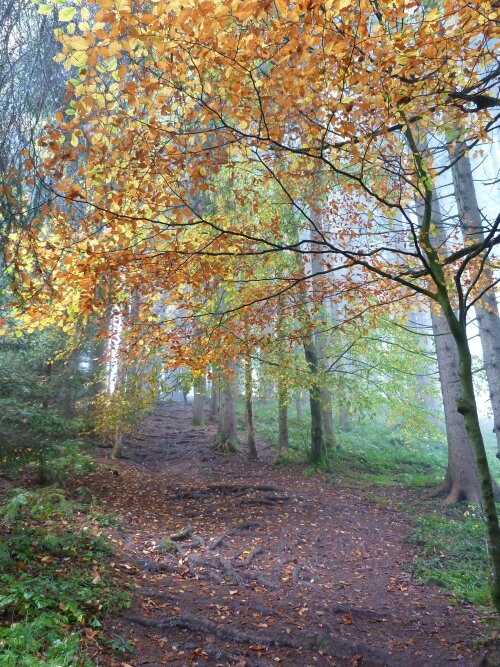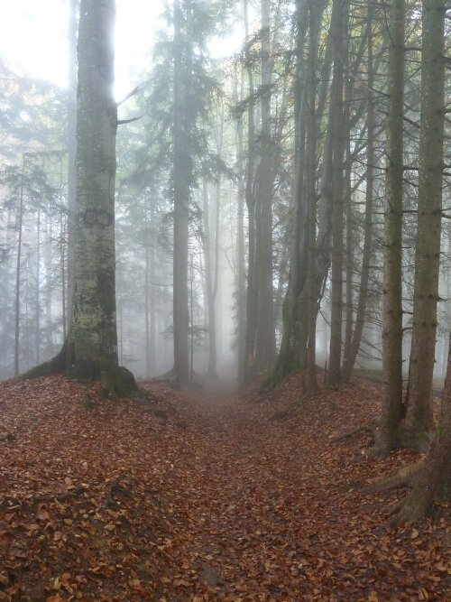 Ich glaube, die kleinen Waldgeister, die in den Bäumen leben, hatten auch Schnupfen, denn überall tropfte es sanft von den Blättern. Daher wohl auch die Rutschgefahr.