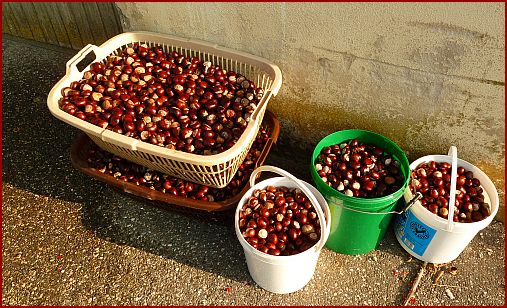 Die Kastanien erinnerten mich an meine Kindheit. Damals hat man kaum eine auf den Wegen oder Wiesen gefunden. Man musste schon großes Glück haben, denn sie waren heiß begehrt bei den vielen Bastlern. Ganze Zoos oder Familien wurden daraus gebastelt, mit Streichhölzern, einem kleinen Hand- bzw. Bastelbohrer und anderem Zubehör zum Schmuck. Auch Eicheln wurden gern verwendet, und mein Vater bastelte gern kleine Fabelwesen aus Bucheckern. Keine Angst, für die Tiere des Waldes blieb genug übrig.