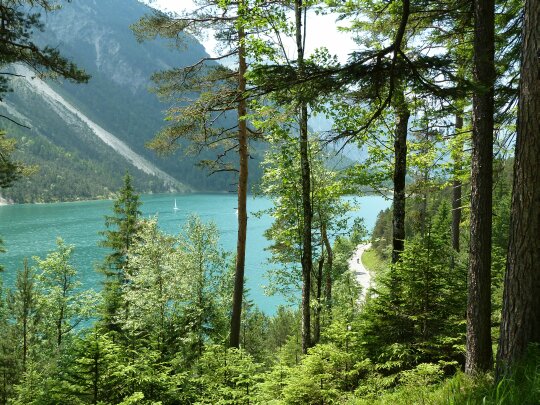 Ein einsamer Segler im Hintergrund, und rechts zwischen den Bäumen, das ist kein Wanderweg, sondern eine Straße, auf der sich fortwährend Wohnwägen, Autos, Fahrradfahrer und vorallem Motorräder hindurchschlängelten.