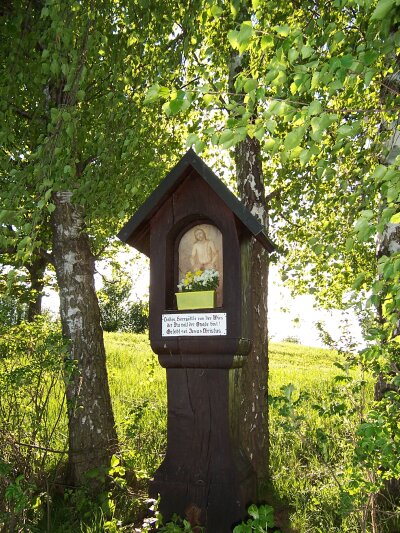 Das Wegekreuz am Wiesenrand inmitten der zartgrün blättrigen Birkenbäumchen fand ich wunderschön und so heimelig.