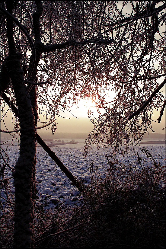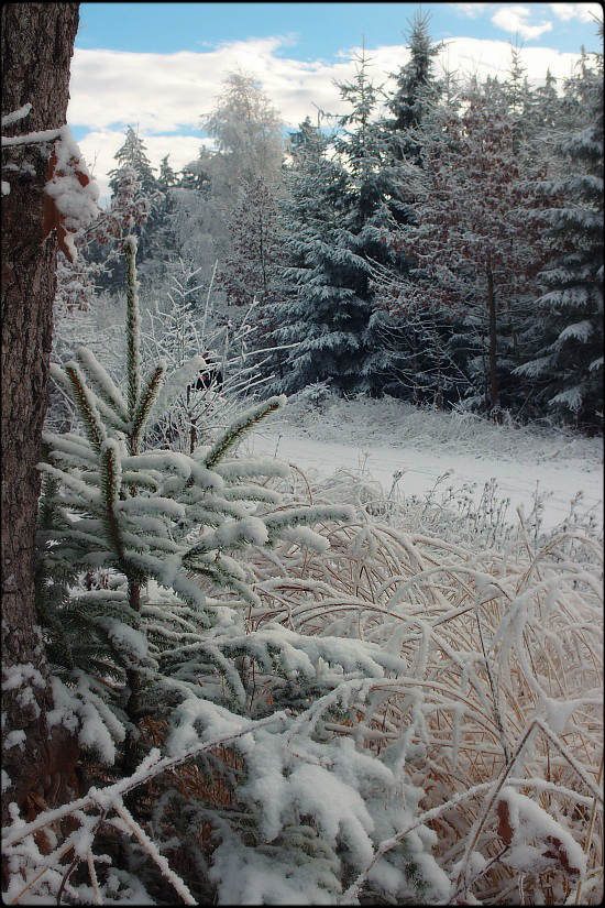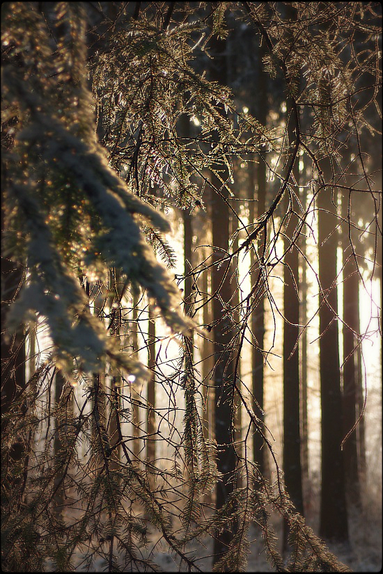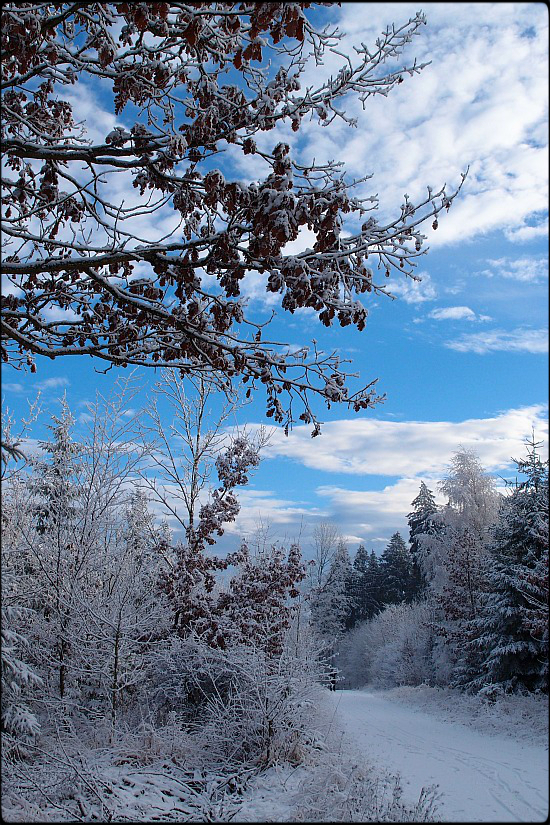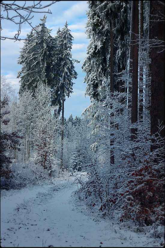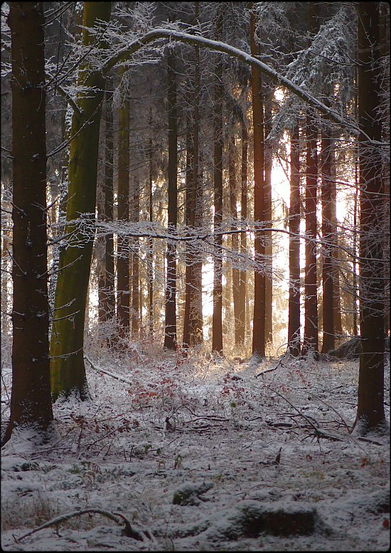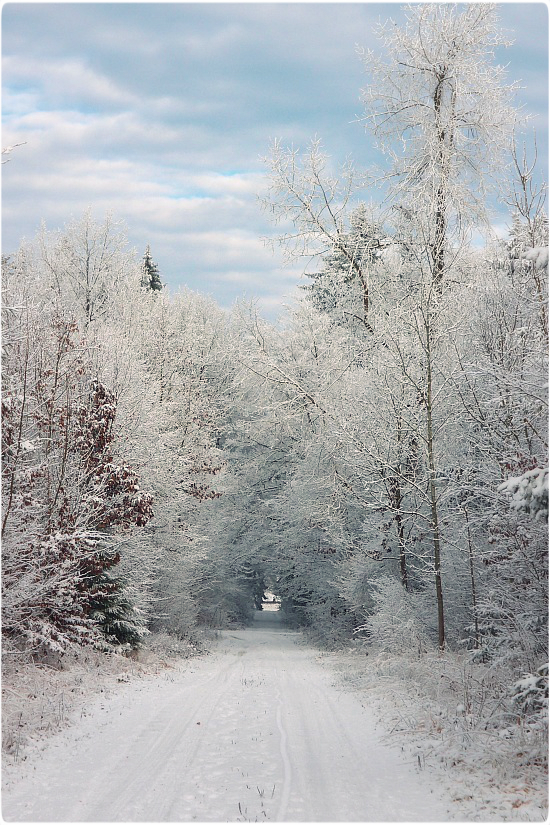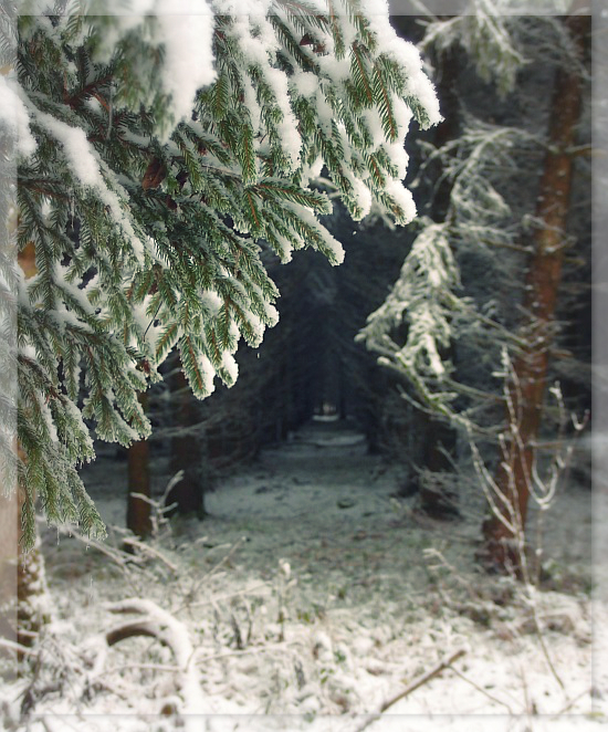 Diese schneebedeckten Zweige, ist es nicht wundervoll? Dahinter der lange "Gang" tief in den Wald hinein. Es gibt doch sooo unendlich viel zu entdecken im Wald.