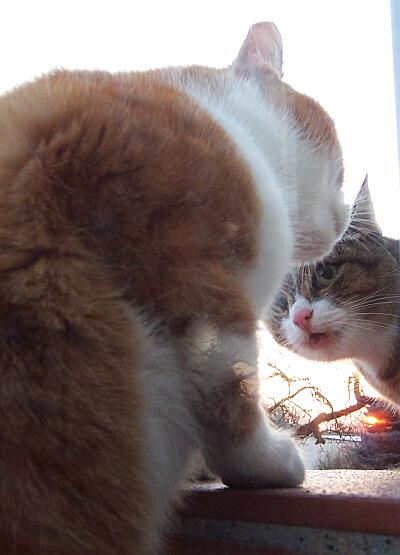 Heute wurde ich hautnah Zeuge einer Kampfszene. Das schauerlich-gewalttätige Schauspiel trug sich direkt vor unserem Terrassenfenster zu. Ich saß also quasi in der ersten Reihe, als sich zwei Kater aus der Nachbarschaft den Platz streitig machten oder - besser ausgedrückt - ihr Revier abklären wollten.