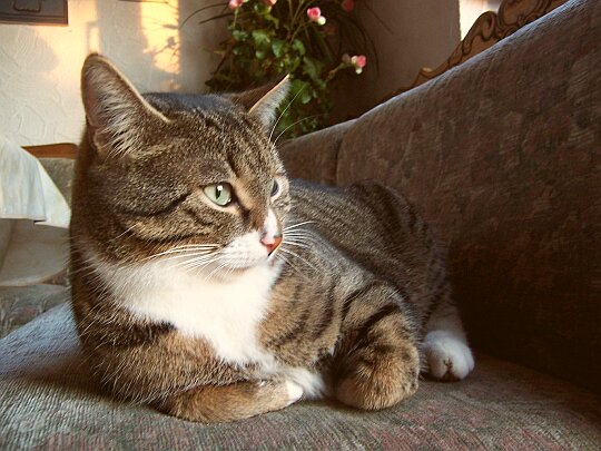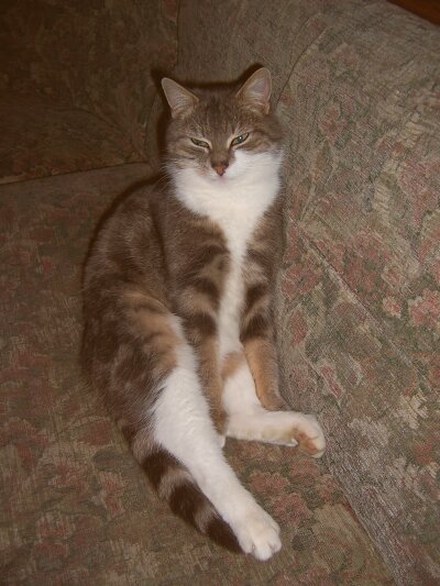 Und hier noch ein Foto von Mimi, die zum Schlafen immer diese Position einnimmt. Sie schaut hier nur mal kurz, weil ich sie fotografiert habe, hat aber gleich darauf so weitergeschlafen. Witzig, gell?