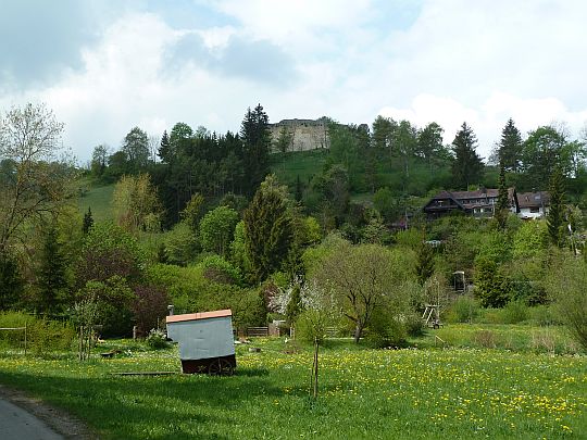 Irgendwann kamen wir wieder im Tal an, und zwar genau unterhalb der Burgruine. Von da oben hab ich schon viele Fotos gezeigt. Und so sieht sie von unten aus.