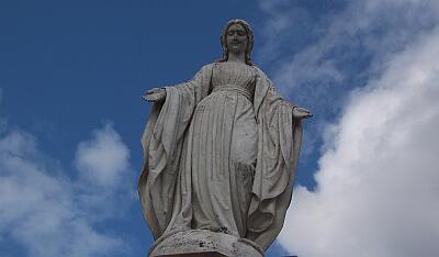 (Gesehen vor einer Kirche in Bad Waldsee. Ich fand den Blickwinkel zur Statue im Hintergrund zum Himmel faszinierend)