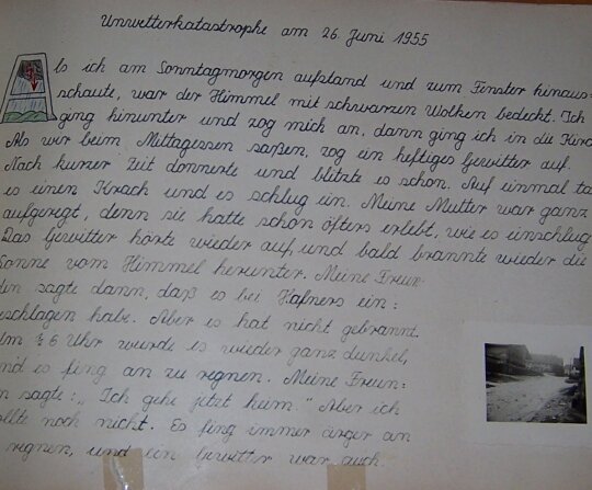 Es war sehr interessant, die vielen alten Fotos zu sehen. Interessant fand ich auch ein altes Schultagebuch, in dem ich ein wenig blätterte. Dabei entdeckte ich, dass dort im Juni 1955 auch ein schweres Unwetter getobt haben muss ...