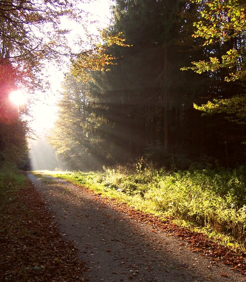Wenn die milde Herbstsonne ihre Strahlen durch das Blätterdach der Laubbäume schickt und dabei dieses Schimmern in den schönsten Farben erzeugt. Das Rascheln des welken Laubes unter den Füßen. Dazwischen das Futter für die tierischen Waldbewohner - Eicheln, Bucheckern und ein vom Schneckenfraß gezeichnetes Pilzchen. Dieser einmalige Geruch nach frischer Erde, der nur zu dieser Jahreszeit eine solche Würze hat. Und diese himmlische Stille. Nur die Stimmen der Natur. Oft bleibe ich stehen, halte den Atem an, um keinerlei Geräusche zu erzeugen, und diese Atmosphäre ganz in mich einsaugen zu können. Wie ich das liebe.
