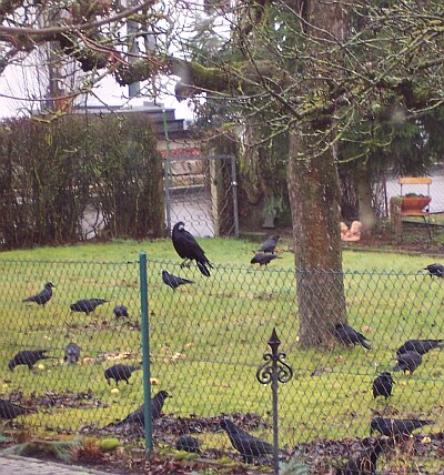viele derer, die in Nachbars Garten Nahrung suchten. Ganz schnell hab ich die Digi gezückt und durchs Fenster fotografiert. Als ich näher rangehen und zu diesem Zwecke die Haustür gaaanz vorsichtig öffnen wollte, flog alles wie auf Kommando davon ...