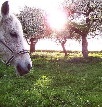 Auch im Gegenlicht fand ich diese Szene reizvoll und wollte eine weitere Aufnahme machen. Gerade, als ich auf den Auslöseknopf drückte, lief mir dies`weiße Pferdchen in mein Bild. Manchmal entstehen durch Zufall die nettesten Bilder ... lach ...