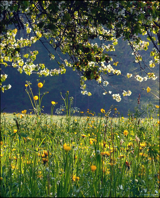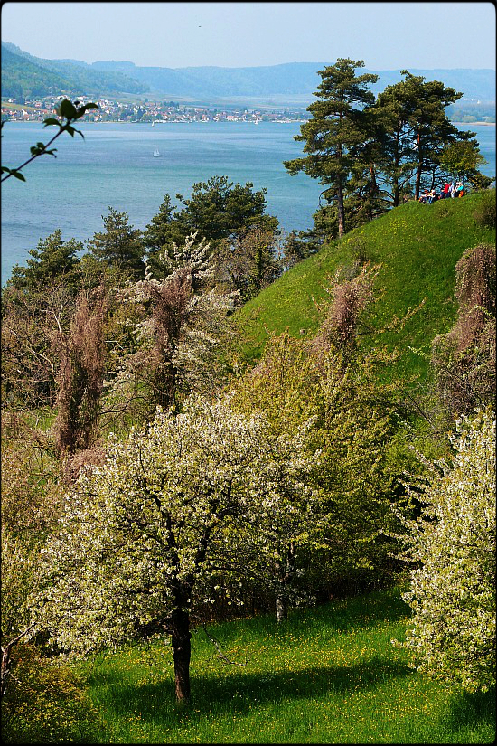 Zum Glück hatte sich die Sonne auf dem Berg schon durchgesetzt. So liessen wir den Aussichtspunkt links liegen und wanderten in der wunderbaren Stille des erwachenden Tages frisch und fröhlich entlang schönster Wiesen und blühender Obstbäume.