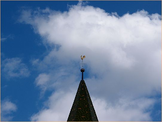 Seht ihr den Wetterhahn auf der Kirchturmspitze? Ich finde ihn goldig. Wenn ihr ganz still seid, könnt ihr vielleicht sein fröhliches Kikerikiiiie hören ... kein Wunder bei diesem herrlichen Himmel, gell?