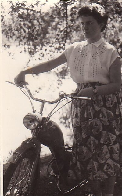 An das Moped kann ich mich noch erinnern. Es hatte später so einen kleinen Sitz ganz vorn. Der war lediglich an der Lenkstange befestigt. Da durfte ich manchmal sitzen und mitfahren. Mit Kopftuch und Brille ausgerüstet ging es die Zschopauer Straße entlang zu den Großeltern. Vorbei an dem großen Krankenhaus, in das du mit mir immer gehen musstest, weil mir der Arzt Höhensonne verschrieben hatte. Ich war wohl etwas blass um die Nase zu jener Zeit. (Igitt, das erinnert mich an das eklige Lebertran, das ich auch nehmen musste.)