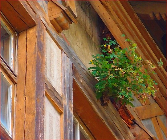 Hier hat sich ein Samenkorn in einem Holzbalken eingenistet. Nun wächst direkt an der alten Hauswand ein schöner Strauch ... und zwar im 4. Stockwerk!!!