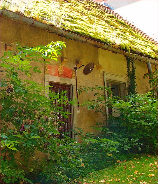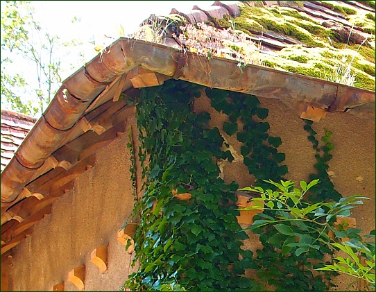 Das gleiche Häuschen. Hier drängelt sich der unermüdliche Efeu schon durch die Dachrinne durch und läuft auch ein Stück an ihr entlang. Aber auch das bemooste und mit Pflänzchen bedeckte Dach fand ich so schön.