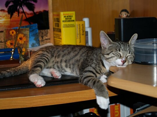 Ansonsten hab ich doch noch eine Beschäftigung für den Nachmittag gefunden. Im Herd steht ein leckerer Blumenkohl-Kartoffel-Auflauf. Ich hoffe, er ist mir gelungen. Ansonsten werde ich es mir jetzt gemütlich machen, wie das Tigerle auf dem Foto. Als er noch klein war, hat er es sich immer auf dem Schreibtisch meines Sohnes bequem gemacht.