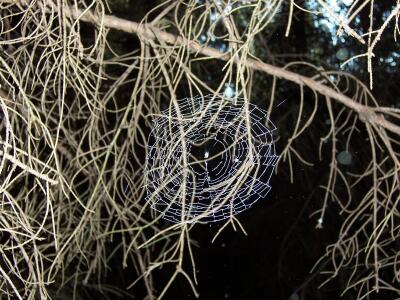 Dann entdeckte ich auch noch dieses Spinnennetz, auf das ein Sonnenstrahl fiel. Es sah so unwirklich aus, dass ich es gleich festhalten wollte. Da es im Wald ansonsten dunkel war und ich vergessen hatte, den Blitz abzustellen, entstand diese surreale Aufnahme ...