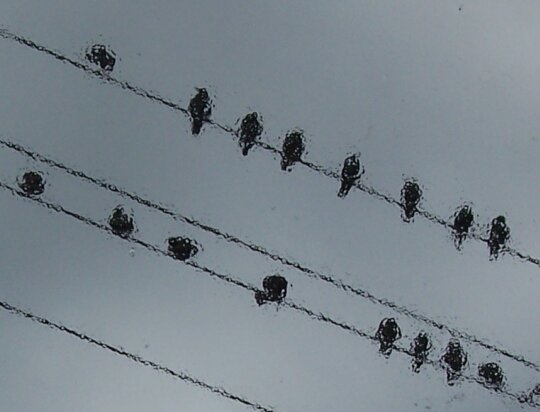 Und hier noch ein ungewöhnlich tierisches Bild. Wie die Noten im Notensystem sitzen zur Zeit die Stare auf den Stromleitungen vor unserem Haus. Ich finde das so lustig. Sie dabei unbemerkt zu fotografieren, gelang mir jedoch nur vor dem Fenster. Zu dem Zeitpunkt ging allerdings grad ein starker Regen nieder. Da ich nicht warten wollte, bis meine Models davonfliegen, entstand dieses Foto. Eigentlich Ausschuss, ich weiß. Ich fand es trotzdem interessant ... und ihr ja vielleicht auch ;-)
