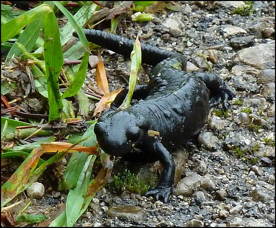 Hallöchen, darf ich mich vorstellen: Ich bin Alexander, der Salamander ... hihi ... und vom vielen vielen Regen hat es meine schönen gelben Sonnenflecken weggespült ... jaaa, seht nur ...