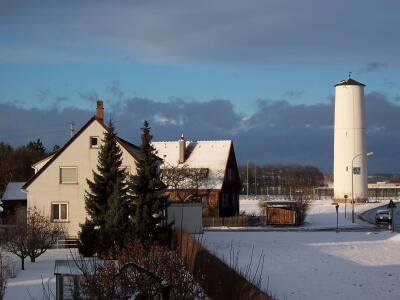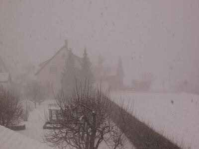 hier schneits ohne Ende. Gestern Abend hatte sich das Wetter beruhigt. So sah der Blick Richtung Wasserturm aus ...