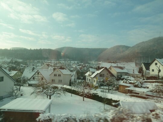 Mit dem BW-Ticket ging es Richtung Schwarzwald durch ein winterliches Märchenland. Aus dem gut geheizten Zug machte es Spaß, auf die überzuckerte Landschaft zu schauen. Da noch Ferien waren, gab es genug freie Plätze. Ich hatte ja erst große Bedenken, mit dem Zug so eine Strecke zu fahren, aber es ging alles gut.