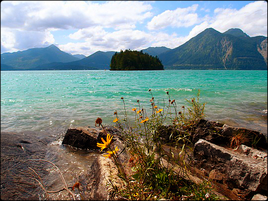 Das Foto vom letzten Eintrag ist auch hier entstanden. Nun habt ihr mal einen Vergleich ... so sah es in Wirklichkeit dort aus. Das Wasser des Walchensees ist tatsächlich so grün-türkisfarben, was am hohen Anteil von Kalziumkarbonat liegt, wie ihr u.a. nachlesen könnt.